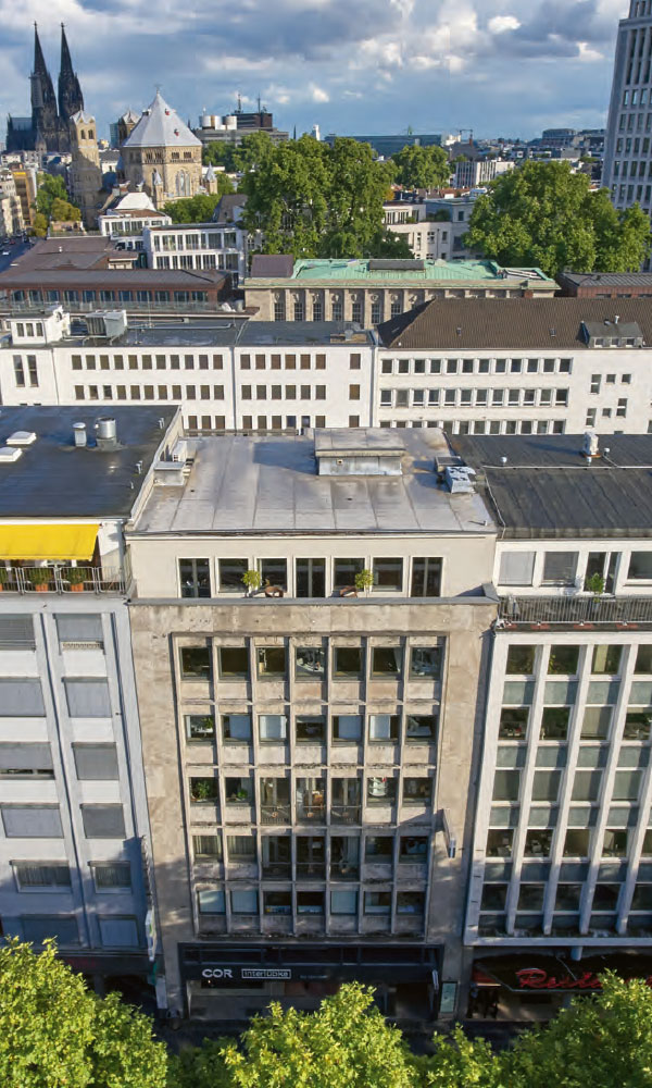 Vielen Kölnern ist das 1956 erbaute Gebäude noch als Sitz der Volksbank Köln Bonn bekannt.Seit dem Erwerb des Gebäudes in 2025 wurde das Objekt grundlegend revitalisiert und auf höchsten ESG-Standard gebracht. Die Grundrisse werden open space angeboten und können individuell aufgeteilt werden. Zur Standardausstattung zählen die originalen Eichenholzböden in Fischgrät-Muster sowie moderne, transparente LoftFX Glas-Stahl-Wände ebenso wie eine Grundbeleuchtung von Artemide und Teeküchen von SieMatic.